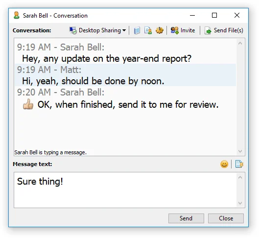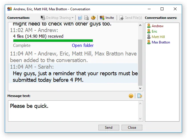 No necesita configurar y mantener un servidor de mensajería dedicado: nuestra herramienta de mensajería instantánea es una aplicación independiente basada en punto a punto.