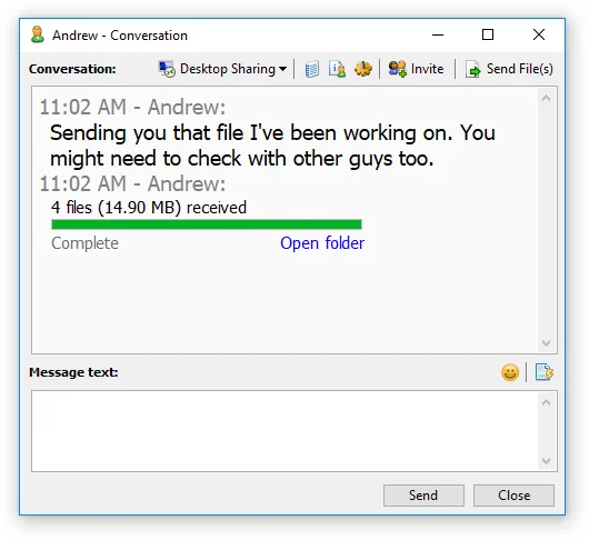 Intercambie fácilmente documentos con sus colegas. Simplemente arrastre y suelte un archivo o carpeta en el ícono del destinatario en la lista de usuarios o en la conversación que está teniendo con ellos.