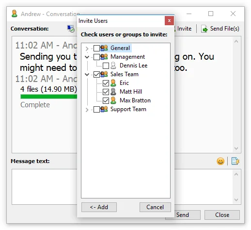 Puede enviar fácilmente archivos y carpetas a varios usuarios al mismo tiempo dentro de una conversación grupal o un mensaje de difusión.