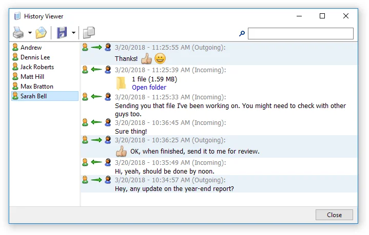 Realice un seguimiento de sus mensajes guardándolos localmente o en un recurso compartido de red. Vea, busque e imprima su correspondencia con otros empleados utilizando el visor de historial integrado.