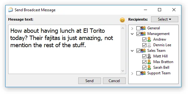 Chat en Red es una aplicación de mensajería LAN fácil de usar para una comunicación dentro de la oficina segura, segura y efectiva. No requiere un servidor para funcionar y es muy fácil de instalar. Chat en Red IM viene con una variedad de funciones útiles, como mensajería de PC a PC, salas de chat de LAN grupales, transmisión de mensajes para notificar rápidamente a personas o grupos seleccionados sobre un evento, y también transferencia de archivos con arrastrar y soltar para intercambiar archivos y carpetas entre los miembros del personal. Todos los mensajes y archivos intercambiados por los usuarios están encriptados de forma segura y nunca salen de la red local de su empresa, lo que garantiza que ninguna persona no autorizada leerá su correspondencia privada ni accederá a sus datos confidenciales.